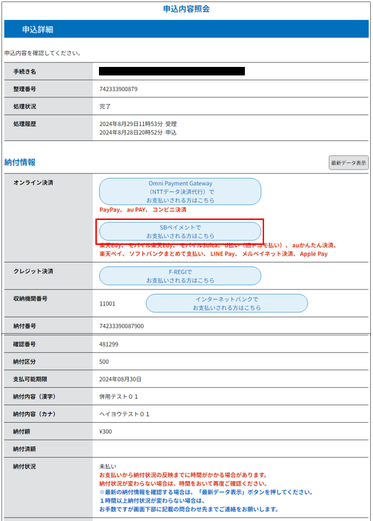 SBペイメントの決済が完了すると、《申込詳細画面》に戻ります。