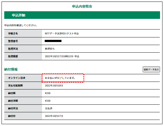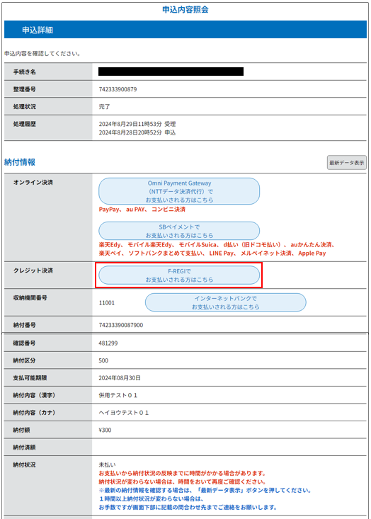 「前納」タイプの場合は、申込が完了した後、 【申請状況確認】 メニューより申込の照会を行って支払います。