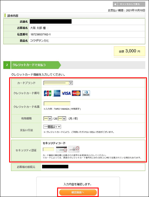 請求内容とクレジットカード情報の入力画面が表示されます。