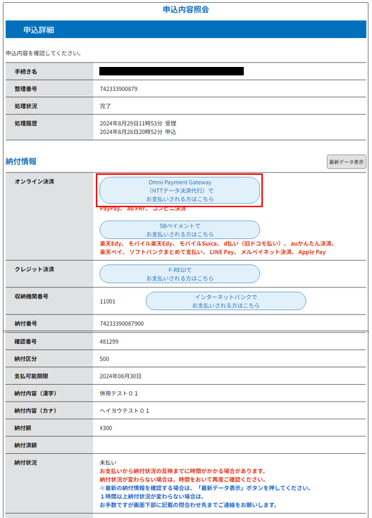 ① 《申込詳細画面》の『オンライン決済』欄の「Omni Payment Gateway(NTTデータ決済代行)でお支払いされる方はこちら」ボタンをクリックします。
