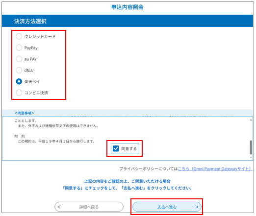 ② 決済方法を選択し、<同意事項>をスクロールして内容を確認後、選択請求金額を確認した上で、同意するをチェックし「支払へ進む」ボタンをクリックします。