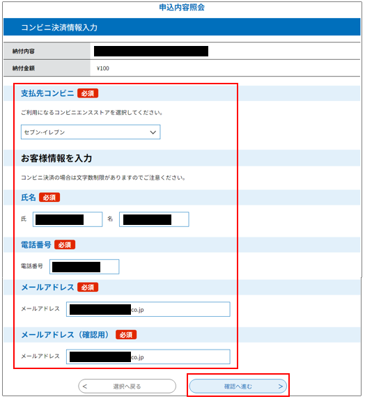 ㉓ コンビニ決済情報(支払先コンビニ、お客様情報「氏名、電話番号、メールアドレス」)を入力して「確認へ進む」ボタンをクリックします。