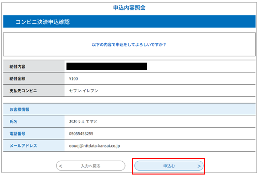 エラーがなければ「コンビニ決済申込確認」画面が表示されます。