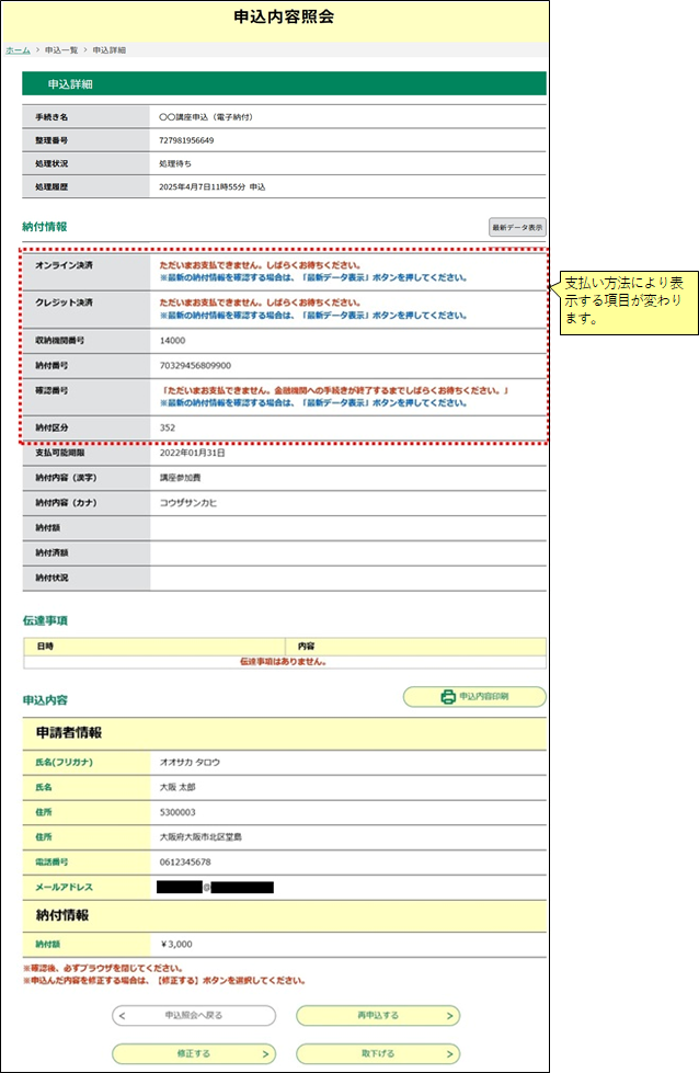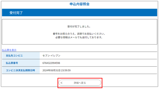 《申込詳細画面》 が表示されます。支払い可能な方法により表示項目が異なります。