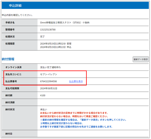 コンビニエンスストアでのお支払いが完了しますと、納付情報の「支払い完了通知待