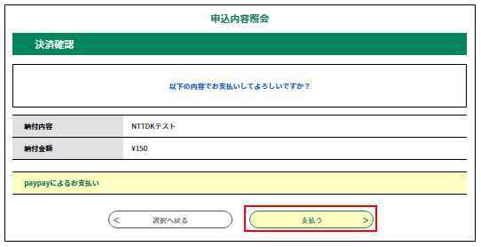 ⑮ 内容を確認して「支払う」ボタンをクリックします。