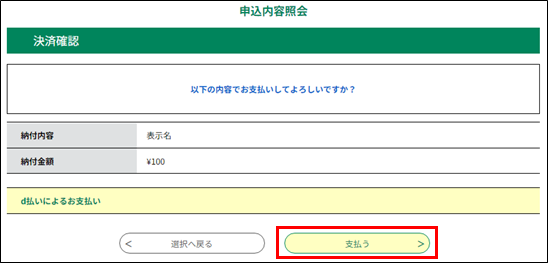 この場合は、申込が完了したら、納付期日までに申込内容照会から支払いを行います。