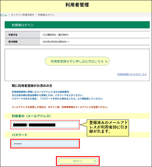 ② 登録済のメールアドレスが利用者IDとして引き継がれた状態で《利用者ログイン画面》が表示されます。