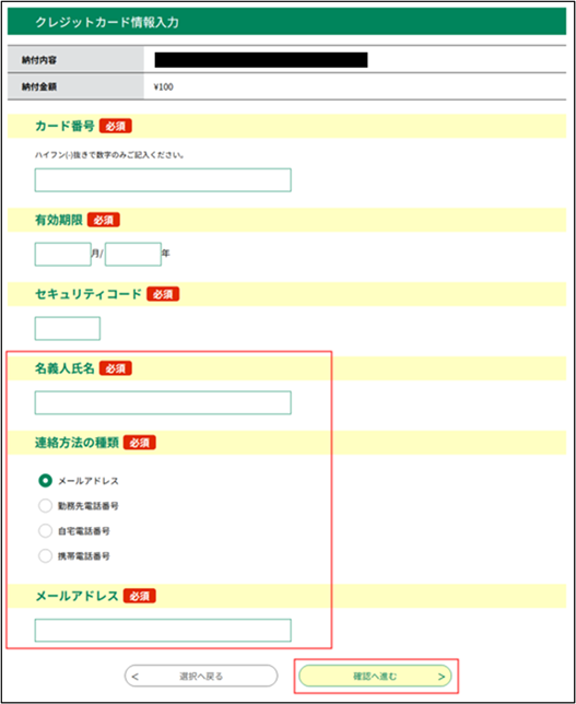 名義人氏名、連絡方法の種類、メールアドレスまたは電話番号)を入力