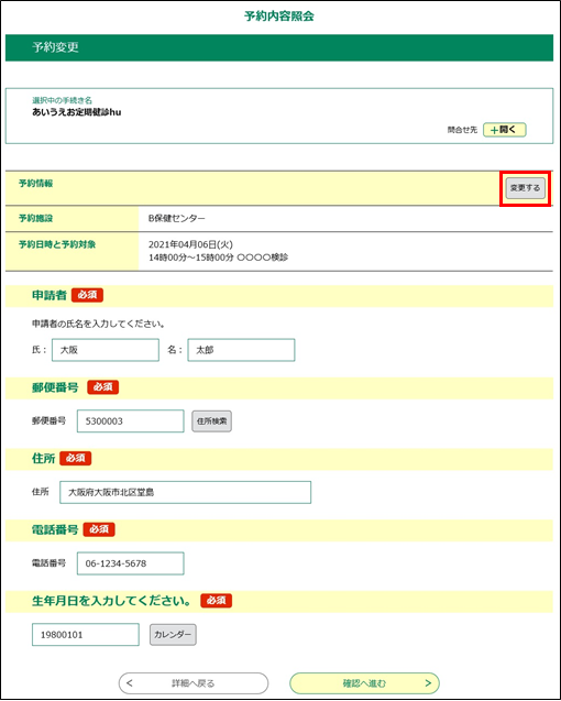 《予約変更画面》に戻ります。