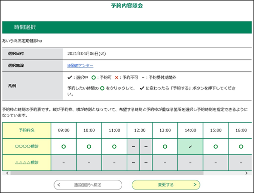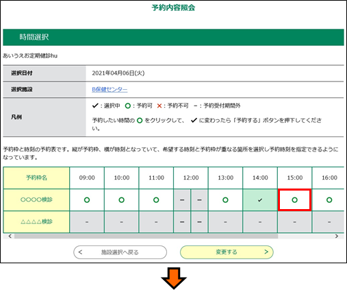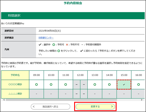 予約日時などの予約情報を変更したい場合は、  変更する  をクリックしてください。《施設選択画面》が表示されます。