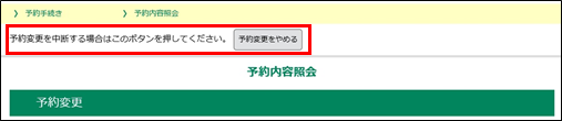 「予約変更を中断する場合はこのボタンを押してください。予約変更をやめる」ボタンが表示されます。 仮予約中に予約変更をキャンセルする場合は、「予約変更をやめる」ボタンをクリックしてください。 キャンセル後は《予約一覧画面》に遷移します。