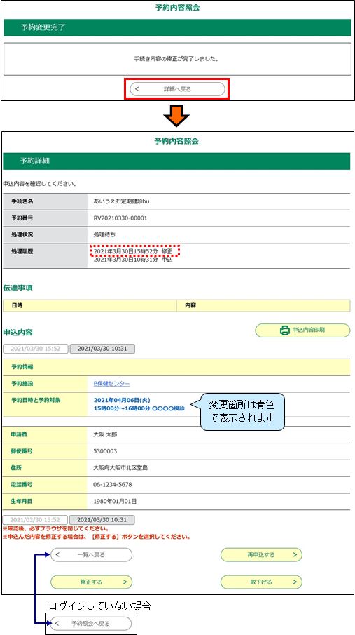 詳細へ戻る  をクリックすると、[処理履歴]に変更結果の反映された《予約詳細画面》へ戻ります。