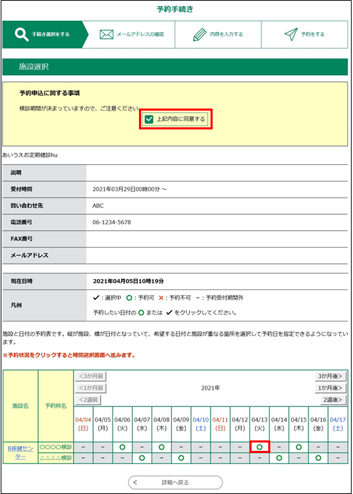 予約したい枠の予約したい日付(たとえば4/13)の”〇”をクリックしてください。