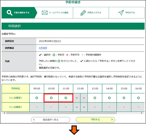 連続した時間帯をクリックすると、クリックした時間帯にも”✔”が表示されて追加予約することができます。(※連続した時間帯(昼休みをはさむことも可)であれば複数の予約が可能)