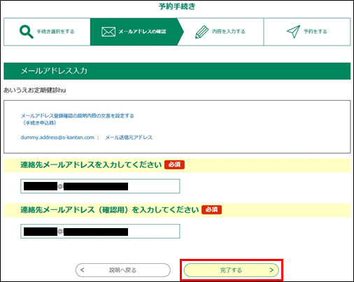 《メール送信完了画面》が表示され、連絡先のメールアドレスへURLを記載した【連絡先アドレス確認メール】が送られます。