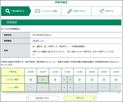 他の時間帯をクリックすると、クリックした時間帯のところに”✔”が移ります。(※1度に1つの時間帯しか予約できません