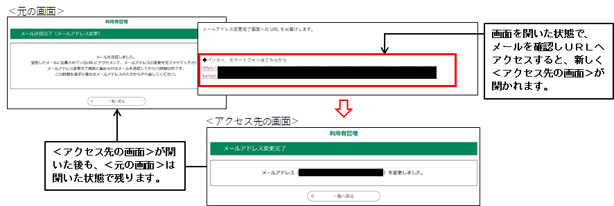 メールアドレスの変更を行う受信メールのURL をクリックすると、新しくアクセス先の画面が開かれ、変更が完了します。
