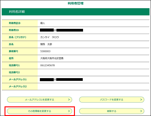 この操作によって、 [パスワード]と[利用者ID(メールアドレス)]以外の利用者情報の変更を行えます。