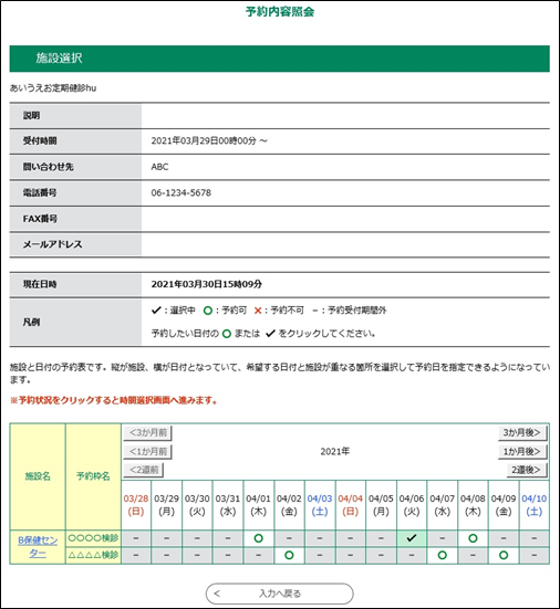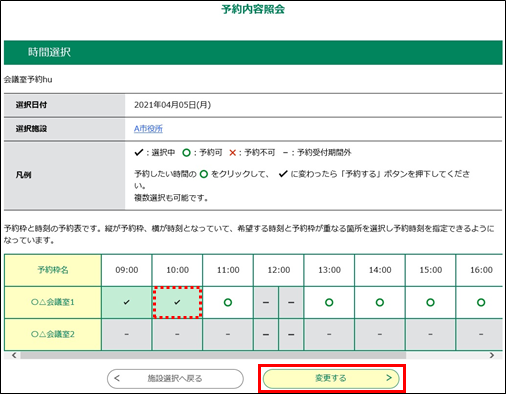 《施設選択画面》で”✔”の日をクリックした場合には、現在予約中の時間帯に”✔”が表示されています。