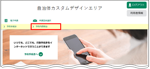 予約の申込状況を確認する場合は、予約内容照会メニューへ進んでください。 (詳細は、『2.1.2 予約照会認証』を参照してください。)