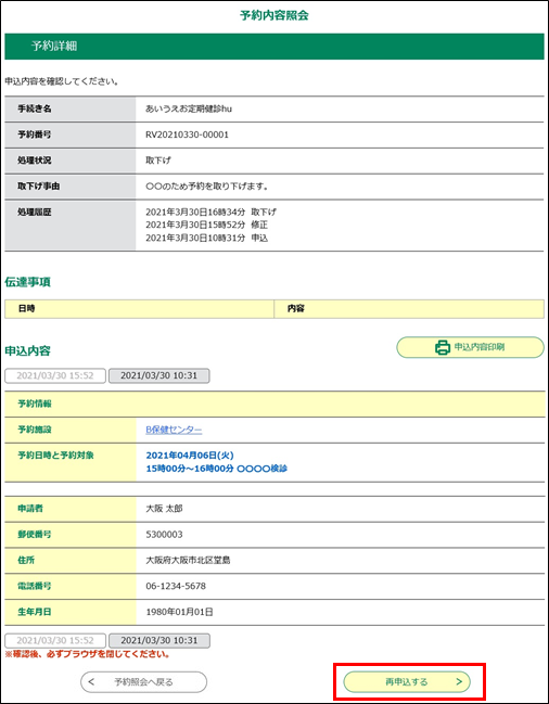 この操作によって、随時発生する手続き等に対し、 過去の予約情報を引きついで再予約が行えます。何度も予約を行う手続きについては、再予約機能を使うと便利です。