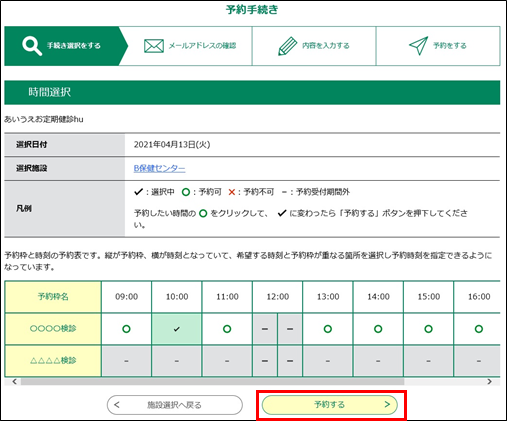予約する時間帯が決まれば、 予約する をクリックしてください。
