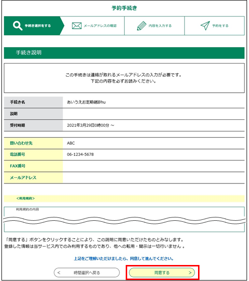 予約申込に関する事項」が表示されている場合は”上記内容に同意する”にチェックをつけた後で