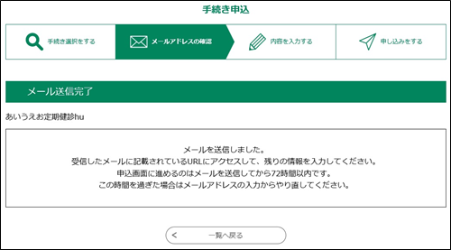 《メール送信完了画面》が表示され、連絡先のメールアドレスへURLを記載した【連絡先アドレス確認メール】が送られます。