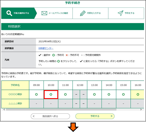 他の時間帯をクリックすると、クリックした時間帯のところに”✔”が移ります。(※1度に1つの時間帯しか予約できません