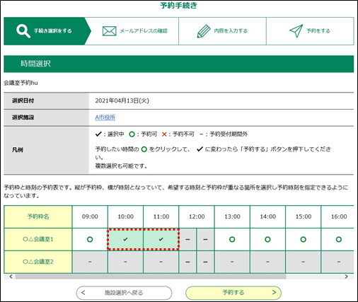 連続した時間帯をクリックすると、クリックした時間帯にも”✔”が表示されて追加予約することができます。(※連続した時間帯(昼休みをはさむことも可)であれば複数の予約が可能)