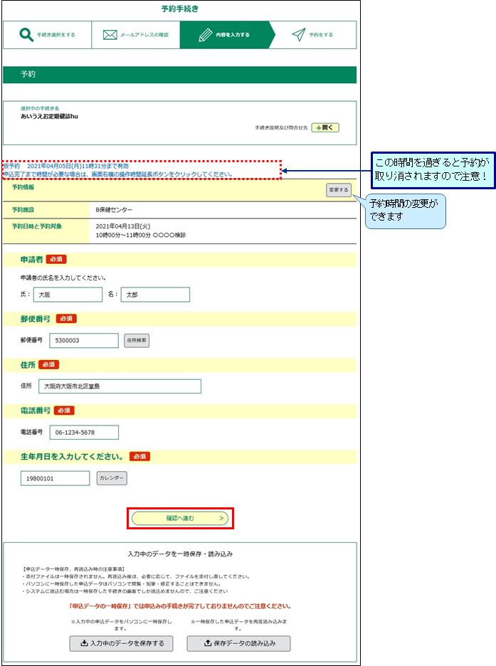 また、仮予約の有効時間までに申込を完了してください。有効時間を過ぎた場合は仮予約が取り消されます。