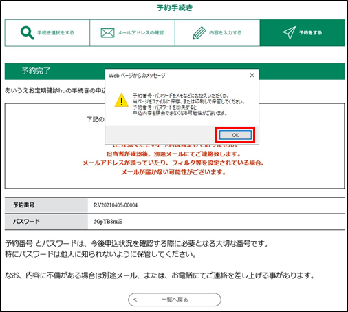 《予約完了画面》に遷移する際に、整理番号とパスワードを控えていただく旨のポップアップメッセージが表示されますので、