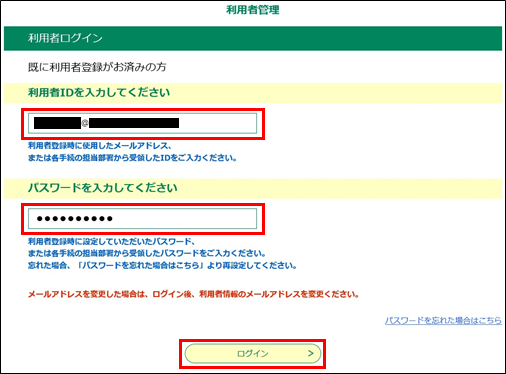[利用者ID(メールアドレス)][パスワード]を入力してください。