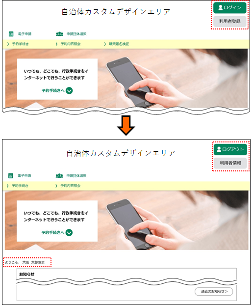 ログイン中は、《手続き一覧画面》[検索メニュー]の上部に利用者のお名前が表示され、メインメニューの表示が変わります。