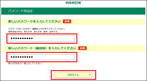 パスワードを入力してください。(半角英数字および記号のみ) ※『』内の記号が、使用可能です。 『 ! # $ % & * + - = ? @ ¥ _ 』セキュリティ上、入力した文字は「●」と表示されます。 セキュリティ上、入力した文字は「●」と表示されます。 ※システム側の設定によっては、入力規則に変更があります。 ※パスワードは、第三者から推測されにくい文字や数字を組み合わせたものを設定するようお勧めします。また定期的な変更もお勧めします。 |